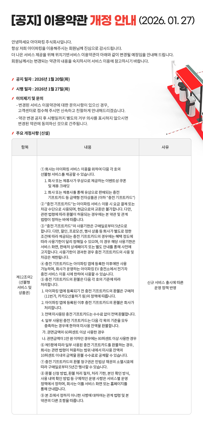 현행 이용약관 전문개정 이용약관 전문 목록 PREV 파프리카(Farfreecar) 이동형 충전 서비스 종료 및 위치기반서비스 폐업 신고 안내 NEXT 아이파킹EV 충전 기프트카드 운영정책 안내